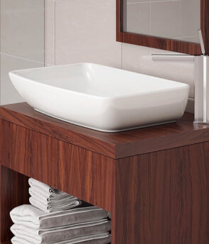 Vessel – A vessel sink is a large bowl that sits on top of the countertop, instead of within it. It’s designed to be used with a vessel faucet.
