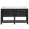 Add industrial style to your bathroom remodel with the Wesley vanity from Cahaba. Oversized hardware, clean straight lines, and two rectangular sinks provide storage and functionality to any restroom. Three predrilled holes for each sink allow you to choose the widespread faucets of your choice, and all hardware and a 3" backsplash is provided for easy installation. Although there are six pulls, this model only induces two drawers and one open shelf spanning the bottom of the cabinet.