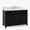 The large countertop and integrated sink of the 49" Beck freestanding vanity provide plenty of space for any bathroom remodel. A beautiful white marble countertop includes a sidesplash that spans the length of the cabinet. While a faucet isn't included, three pre-drilled holes are perfect to install the widespread faucet of your choice. Two soft-close doors conceal shelves, and deep drawers are large enough to store your supplies.