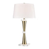 The Brandt Table Lamp is a modern glam take on traditional design. Perfect for living rooms, bedrooms or halls, the elegant, metal torch shape of this piece comes in an opulent, gold finish and is cinched at the waist with a clear, crystal band. This design includes a clear crystal base and cap that strike balance in its look. Its poised look is completed by a round, faux silk, hardback shade in white.