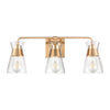 The Brookville 3-light vanity has angular mid-century style with functional design. Clever placement of metalwork inside the glass along with a clean, stepped backplate and hidden mounting hardware keeps the design refined. Finished in Burnished Brass with clear glass.