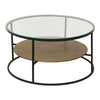 The stylish Callie Coffee Table features a circular design with a fixed metal shelf in a brass finish, visible through the tempered glass top making it light and sleek.