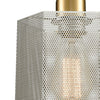 The Compartir collection features hexagonal perforated metal diffusers that nest together to form a honeycomb structure suspended from angular hardware. The Satin Brass/Polished Nickel finish has a visually interesting contrast of metallics.
