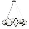 Rectangular metal channel, finished in Black, is meticulously formed in a curl design to create a unique and dramatic design. Clear Seedy glass balls supported by cups of Polished Nickel are strategically positioned to balance out the design.