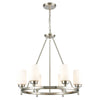 The Dawson collection features a stepped ring which holds solid turned metal accents and opal white glass cylinders. The Satin Nickel finish gives it a fresh and modern feel.