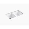 Discover the efficient and stylish performance of the Kohler Deerfield Enameled Cast Iron Double Basin Undermount Kitchen Sink. The durable enameled cast iron construction resists chipping, cracking, and burning, while the gleaming white finish and seamless transition from counter to sink makes for a clean, clutter-free design. Enjoy a roomy basin depth of 9"—perfect for filling large pots—and two basins for more effective cleaning and organization.