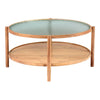 The Denz coffee table features a round table top with tastefully ridged glass. Solid acacia construction, including a secondary shelf, ensures this coffee table is a showstopper.
