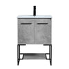 Live in modern comfort with this 24" concrete grey finish vanity. Dressed in a concrete grey and sleek black metal hardware, its contemporary style will have your bathroom or powder room elevated in industrial sophistication. The open shelf at the base and two doors reveal ample storage space for your bathroom essentials and miscellany. Clean lines create its own visual interest, adding trendy looks to your already chic room.Product Description: