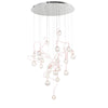 Numerous spheres of heavy Bubble Glass are suspended in an avant-garde fashion connected at various points with a contrasting red cord that creates an artistic impression of light. The Polished Chrome canopy reflects light from the integrated LED in a galaxy-like fashion.