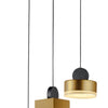 These geometric pendants can be arranged at various heights to create both a sculptural and functional form. Housings of plated Gold in various shapes and sizes are topped with a round handle of Black and finished on the bottom with a Clear acrylic diffuser.