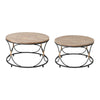 The Fisher Island Coffee Tables are small round metal tables, one slightly smaller than the other. The looping black metal bases are tied with rattan, adding a note of natural materials to complement the wood table tops. The mix of industrial and coastal materials makes these tables a thoroughly modern and versatile statement for any style room.Specs/Dimensions: