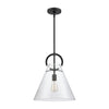 The Gabby pendant has a trend-forward diecast ring that "clasps" a conical shaped glass. Finished in Matte Black with clear glass.