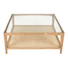 The Harrington coffee table features a sculpted frame made of solid oak, with a tempered glass table top and lower shelf woven from natural cane. Natural wood textures and colors combine to create a modern rustic stand out.