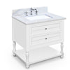 With a white ceramic sink under a Bianco Venatino Italian marble countertop, the Wilora Hartwell 31" Freestanding Vanity Cabinet mixes the modern elements of a Shaker cabinet, but with the classic details common in a traditional style, like decorative pulls and beveled posts.