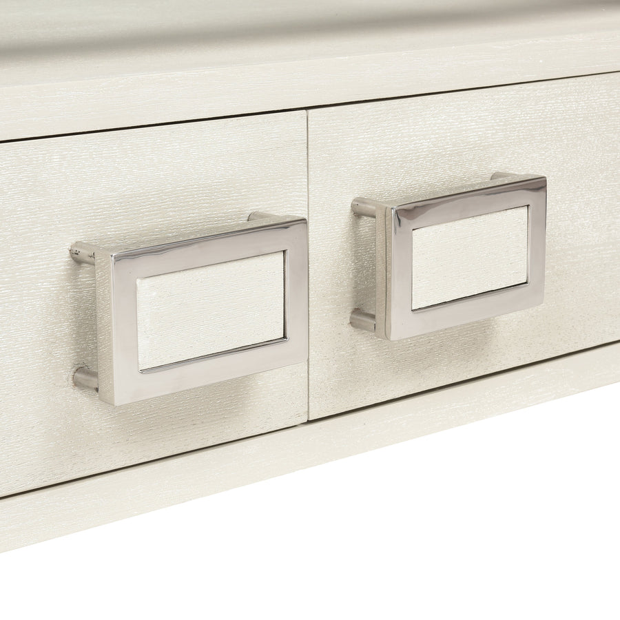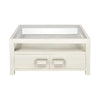The Hawick Coffee Table is a striking two-door storage table made from ash solids and veneer with a weathered white painted finish. The top is made from clear tempered glass, and a lower shelf above the storage doors offers an additional display surface. Each door features a central metal rectanglular door handle with a center panel made from the same cerused wood.Specs/Dimensions: