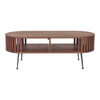 This coffee table is blazed in richly veneered solid walnut with gated paneling that details it's spacious storage areas, tapered steels legs, and a rounded silhouette.