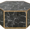 The Homer Coffee Table makes a sculptural statement. With a solid hexagonal shape, each side is paneled with black marble and framed with gold leaf metal.Specs/Dimensions: