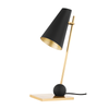 This sleek, clean table lamp is a study in shapes and colors. A round ball in soft white or soft black rests atop a rectangular aged brass base. The slanted aged brass arm holds an equally askew conical shade that coordinates with the round ball on the outside and the arm on the inside.Specs/Dimensions: