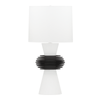 Individual stacked rings of aged iron wrap the body of this gorgeous table lamp. The soft white plaster finish and Belgian linen shade give the fixture a soothing, organic feel. Light is cast both up and down from the classic drum-shaped shade, filling any space with a warm glow.Specs/Dimensions: