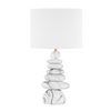 Inspired by stacked river rocks, this lamp will bring a sense of calm and serenity to any table it graces. The base is a series of delicately balanced, smooth ceramic "stones" in a marbled blue or gray finish that keeps with the fixture's natural feeling and adds just the right hint of color. Light fills the white linen drum shade and shines down softly illuminating the base as well.Specs/Dimensions: