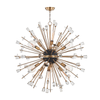 Liberty starts with a core of matte-black metal, banded round its middle with a flashing contrast from the piece’s finish of choice—brass or nickel. Retro coil bulbs in ballooning clear glass create the primary light source; in larger models, tubular exposed-filament bulbs alternate. Cut-crystal discs and icy handcrafted glass adorn protruding rods, refracting the dazzling light in a thousand directions.Specs/Dimensions:
