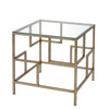 The Louisville Accent Table is a small square table with a glass top. Four sides are framed in gold metal with an angular, geometric pattern.Specs/Dimensions: