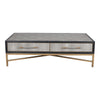 Feeling for the timeless glamor of art deco with a modern twist? Meet the Mako collection. With each item upholstered in the highest quality vegan leather shagreen, the Mako collection brings effortless style, visual texture and substance to your living space. The perfect centerpiece to tie your living room together, this coffee table's black oak frame and brass-finished metal legs deliver personality and durability. Two easily accessible slide out drawers provide ample storage, ensuring the Mako coffee table reputation as a true modern classic.