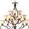 For a traditional, yet vaguely rustic design, the 40" tall three-tier chandelier uses fifteen 60-watt bulbs (not included) softened behind Wilshire glass shades attached to an oil-rubbed bronze frame of sweeping, round bars. The combination of warm colors with warm lighting provides a cozy ambience that is as much at home in a large farmhouse dining hall as it is in a Victorian ballroom.