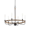 Rustic charm in an elegant, yet simple chandelier with warm distressed wood finishes and textured black metal arms. Black candle covers evoke wax candles to complete the classic and transitional appeal of this series. The flush mount features a satin white diffuser to soften the lamps within.