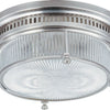 This 13" x 4.75" Hi-Bay Flush Mount is crafted durably with Iron and Glass materials. The light fixture uses 2 E26 Medium Incandescent light bulbs, and features a Clear Holophane glass shade. With a dry safety rating, this light fixture would go great in a bedroom, a kitchen, or other low-humidity living areas in your home.