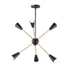 A classic mid-century look, the Lovell collection features two sizes of sputnik chandeliers and streamlined sconces perfect for bath vanity applications. Available in a Black/Satin Brass finish combination. Light bulbs nest inside the metal cones to become an element of the design.
