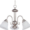 Built on a central satin nickel steel frame with traditional contours and beveled edges, the sweeping minimalist branches of the 20" x 15.5" Malaga Mini-Chandelier deliver light to your area. And with flaring marbled glass shades, this ceiling light produced a graceful, understated elegance. While it's clearly rooted in a traditional aesthetic, the modern contemporary shapes gives it a broad appeal, making this the great chandelier to use in a transitional style.