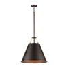 Elevate the industrial with meticulously crafted metal spun shades in Oil Rubbed Bronze with Antique Brass rivet details on matte black straps and brass hook suspension system. Light emits from both the top and bottom of the pendants as well as reveals spaced along the band on the flush mount. The large 3-Light pendant includes a frosted glass diffuser that conceals the light cluster within and evenly diffuses the light below.