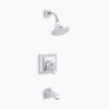 Add the classic details of Memoirs to your shower with this bath and shower valve trim. The trim includes a spout, Deco lever handle, and showerhead--each featuring a clean, traditional style for easy coordination. Pair this trim with a Rite-Temp pressure-balancing valve, which maintains your desired water temperature during pressure fluctuations. Add style and convenience to your home with this bathtub and shower faucet from Kohler's huge selection of tub shower faucets.
