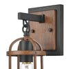 The Millville vanity light features a cage design with mini rivets for rustic appeal. The two-tone matte black and dark oak finish adds a warm character to any space.