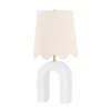 Roshani is undeniably unique, yet utterly usable. A smooth, matte white ceramic shape reminiscent of a magnet draws the eye and attracts attention. The sconce is draped over an aged brass backplate and the table lamp is topped by a natural linen shade with pretty scalloped detailing and aged brass accents. Both fixtures give off a warm, soft glow.Specs/Dimensions: