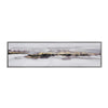 Newton Lake Framed Wall Art is a wide horizontal abstract painting featuring soft watery swirls of grey and black, which converge in the center like a land mass in a body of water. Textured gold paint adds a luxe note. This piece comes ready to hang with a thin silver painted frame.Specs/Dimensions: