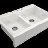 - 50/50 Double bowl with low divide - Sinks are pre-drilled for a 3-hole faucet; single hole faucet installations will require a cover plate