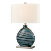 The Portview Table Lamp is a perfect choice for bringing a pop of light blue color to a modern coastal living room or bedroom. This design is made from glass and features a swirling blue finish that calls to mind rushing waters. Keeping the look current, its metal base and appointments come in a polished nickel finish. The look is completed by an oval, hardback shade in white, linen fabric.