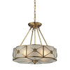 This English inspired design has solid Brushed Brass construction with curved frosted glass panels elegantly arranged around the perimeter. Each panel has a cast brass medallion at the center of each curved glass for a regal enhancement.