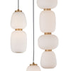 Inspired by Japanese lanterns, this soft contemporary collection features Satin White glass shades of various shapes and sizes mounted on metal frames finished in a dramatic two-tone Gold with Black accents.
