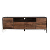 Bring the vibrant organic hues of solid mango wood into your living room with the Tobin Media Console. The contrast of the dark and medium stain elevates the natural tones in the wood grain and knots. Two large shelves are located behind push doors and provided storage solutions for your DVDs, CDs, and records, and additional open storage exists behind the other two doors.
