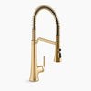 Add a modern look to your kitchen sink with the Kohler Tone Pre-Rinse Kitchen Faucet in Vibrant Brushed Moderne Brass. Cleaning those dirty dishes just got easier thanks to the three-function spray head. With a high-arc spout you'll be able to fit all of your in dishes in with ease.